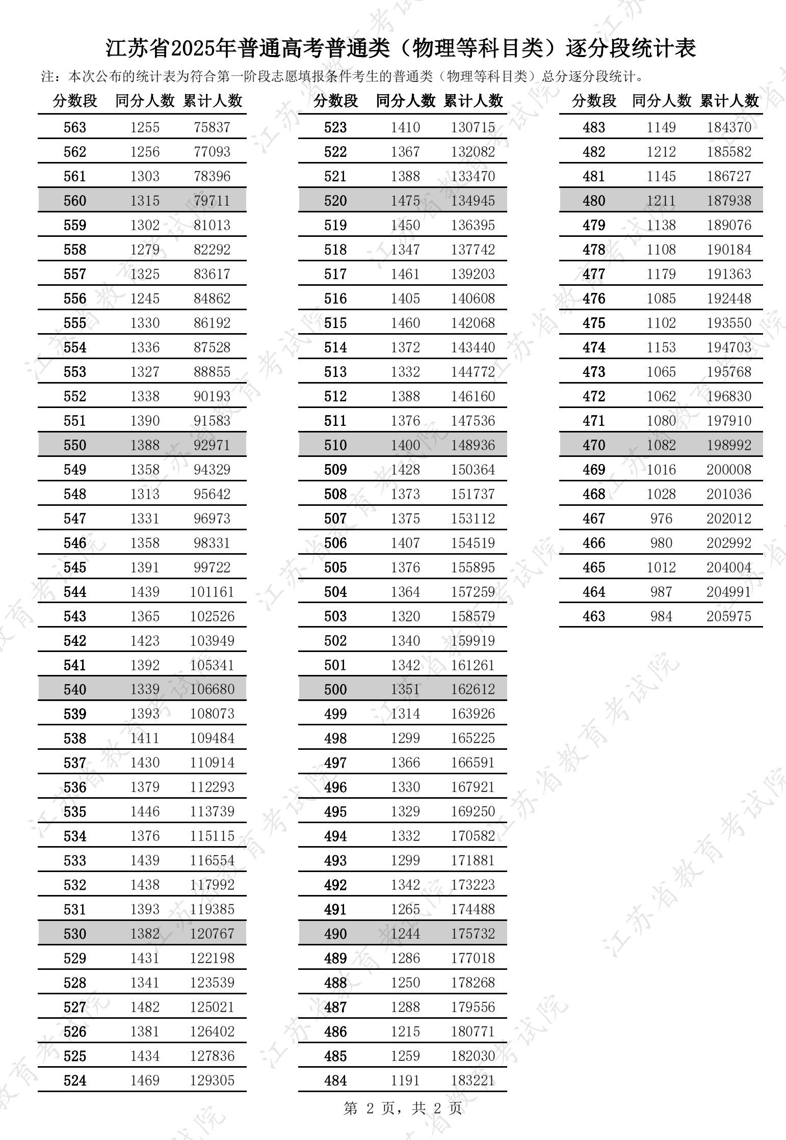 江苏:2025年普通高考第一阶段普通类逐分段统计表(物理等科目类)