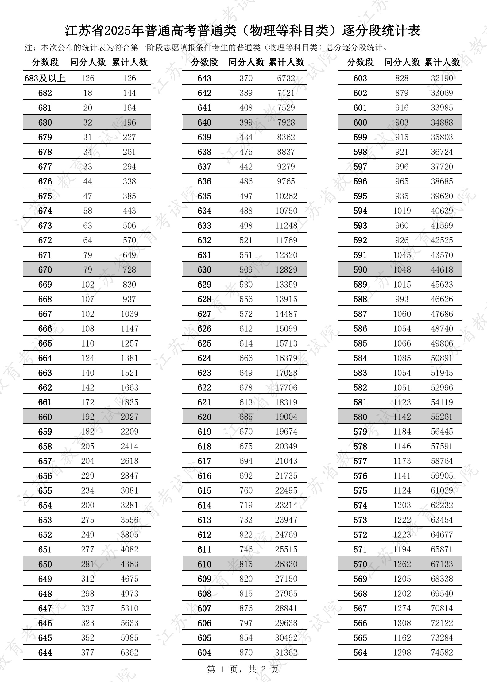 江苏:2025年普通高考第一阶段普通类逐分段统计表(物理等科目类)