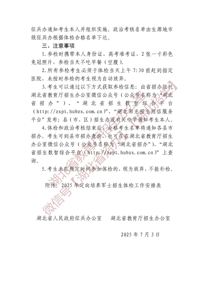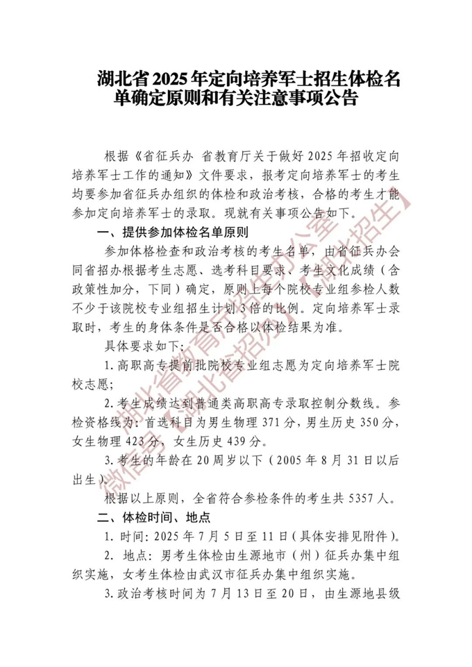 湖北:2025年定向培养军士招生体检名单确定原则和有关注意事项公告